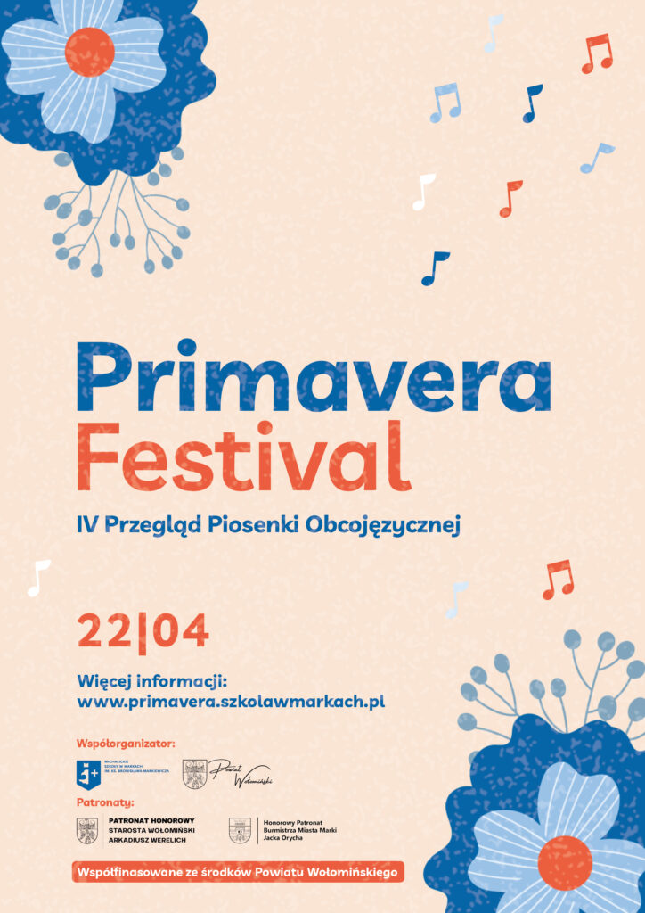 Michalickie Szkoły w Markach mają zaszczyt zaprosić uczniów szkół podstawowych i ponadpodstawowych z całego powiatu do udziału w kolejnej edycji Primavera Festival.